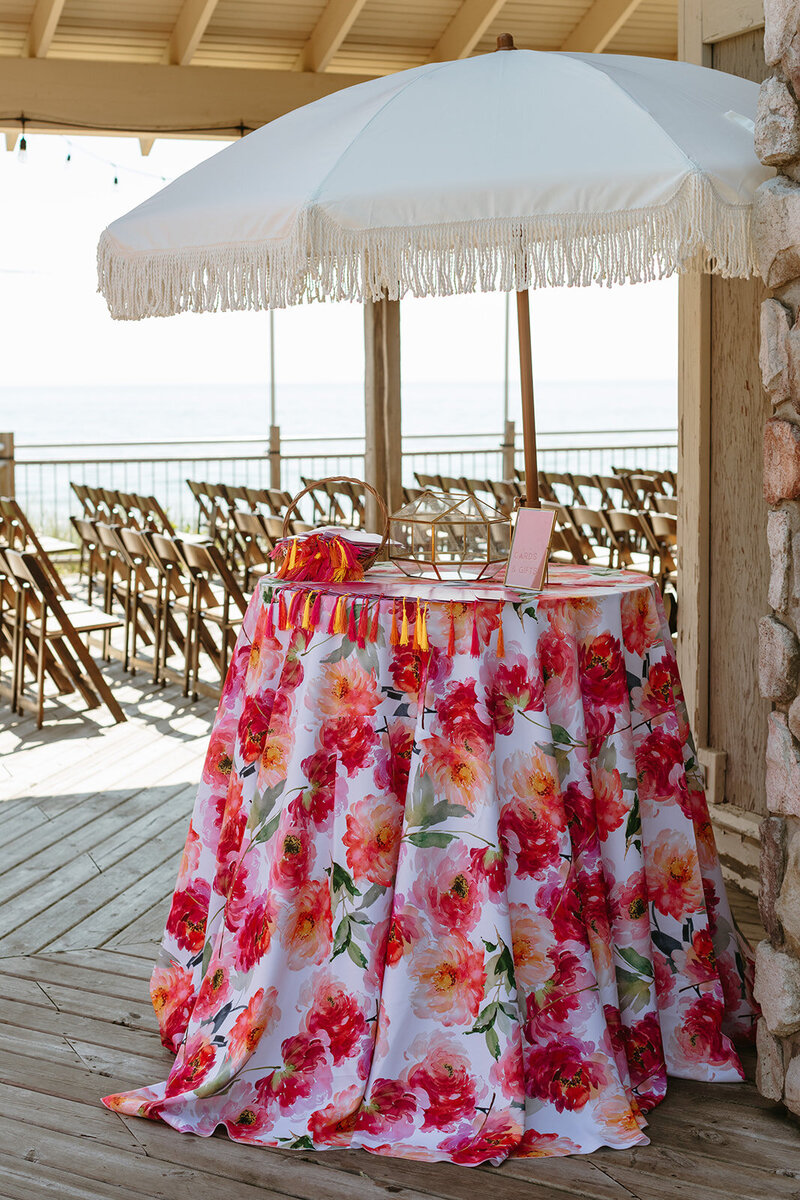 As guests arrived, they were greeted with fringed programs and signage that carried the sunset palette forward. The ceremony took place with Lake Michigan as the dramatic backdrop, and Annie and Zander were framed by twin floral arches — later repurposed to create a dreamy vignette behind their head table.